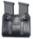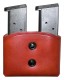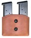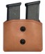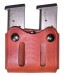 "The Double Take is a Stocking Item. This exceptional double magazine carrier is lightweight and comfortable and has potential for a rapid reload if needed. This magazine carrier features double tension screws for adjustment of the draw and two pull the dot snaps for added security. These are one way snaps and will only snap on and off when pulled in a specific direction. These snaps are used for additional security, when it is imperative that the snap not come undone. The Double Take is not molded to the exact magazines by design. It is made to fit Single Column and Staggered Magazines. The Double take fits up to a 1-3/4"" belt {1-1/2"" is optimum} and is available in tan , black or natural finish in cowhide. In horsehide, black or natural finish(Tan Pictured)"