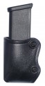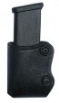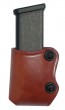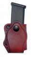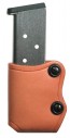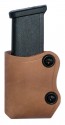 The Tie Breaker is a Stocking Item.The Tie Breaker is as compact as a magazine carrier can be and has potential for a rapid reload if needed. Lightweight and comfortable it features double tension screws for adjustment of the draw and a pull the dot snap for added security. These are one way snaps and will only snap on and off when pulled in a specific direction. These snaps are used for additional security, when it is imperative that the snap not come undone. The Double Take is not molded to the exact magazines by design. This magazine carrier is made to fit Single Column and Staggered Magazines. Made to fit up to a 1-3/4 belt {1-1/2″” is optimum} and is available in tan, black or natural finish in cowhide. In horsehide, black or natural finish. (Tan Pictured).